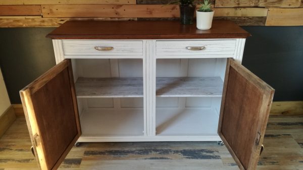 Le plateau est resté brut et teinté pour lui redonner de la profondeur. Un effet shabby à été donné au corps du meuble.